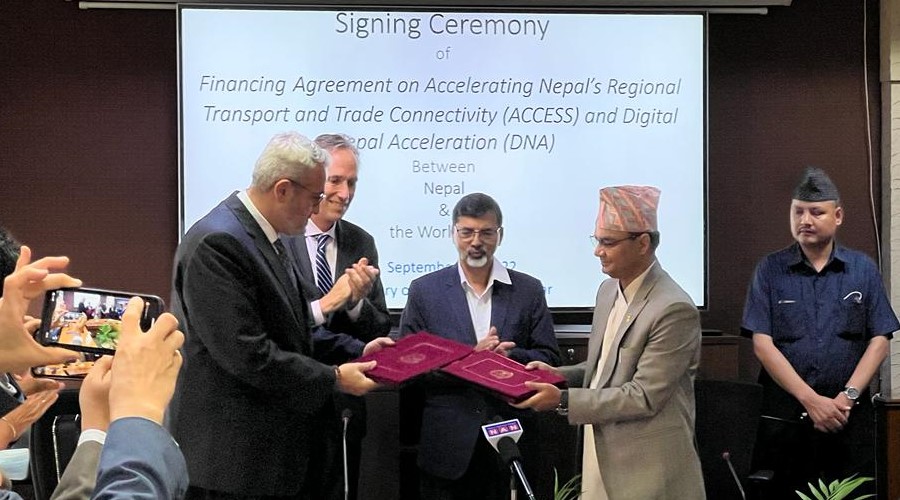 KATHMANDU: The Government of Nepal and the World Bank today signed concessional financing agreements for $275 million (equivalent to NRs. 34.96 billion) for the Accelerating Nepal’s Regional Transport and Trade Connectivity (ACCESS) Project and $140 million (equivalent to NRs. 17.79 billion) for the Digital Nepal Acceleration (DNA) Project.