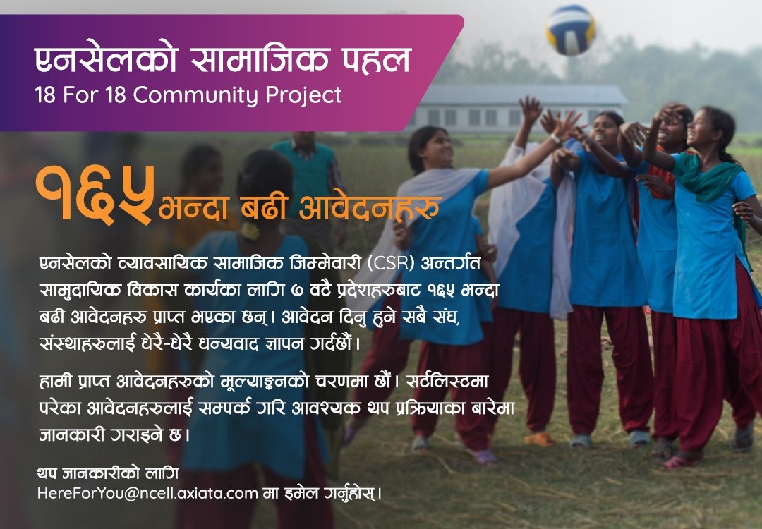 Each selected project will be provided with financial assistance of up to a maximum of NPR 1 million. Under the 18 for 18 community project, the company will select a total of 18 projects. Two projects will be implemented in each province, and the remaining four projects will be added in selected provinces based on the impact that the projects can create at the community level of those provinces.