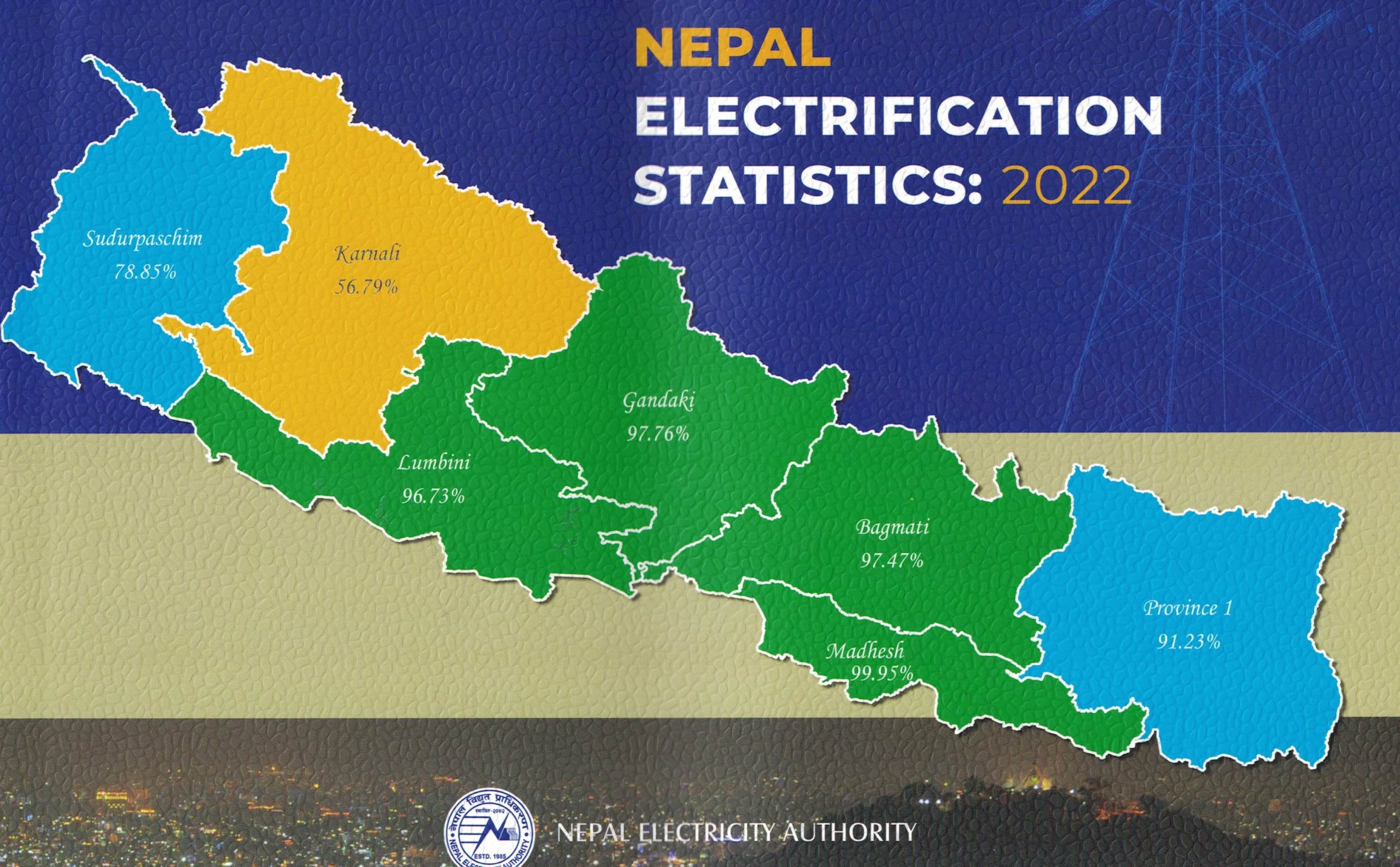 Madhesh province has the highest electrification rate of 99.95% and Karnali province has the lowest electrification rate of 56.79%. According to the Nepal Electricity Authority, 91.23 percent in Province 1, 97.47 in Wagmati, 97.76 in Gandaki, 96.73 in Lumbini and 78.85 percent in Sudurpaschim Province. Out of 77 districts, 42 districts have been fully electrified.