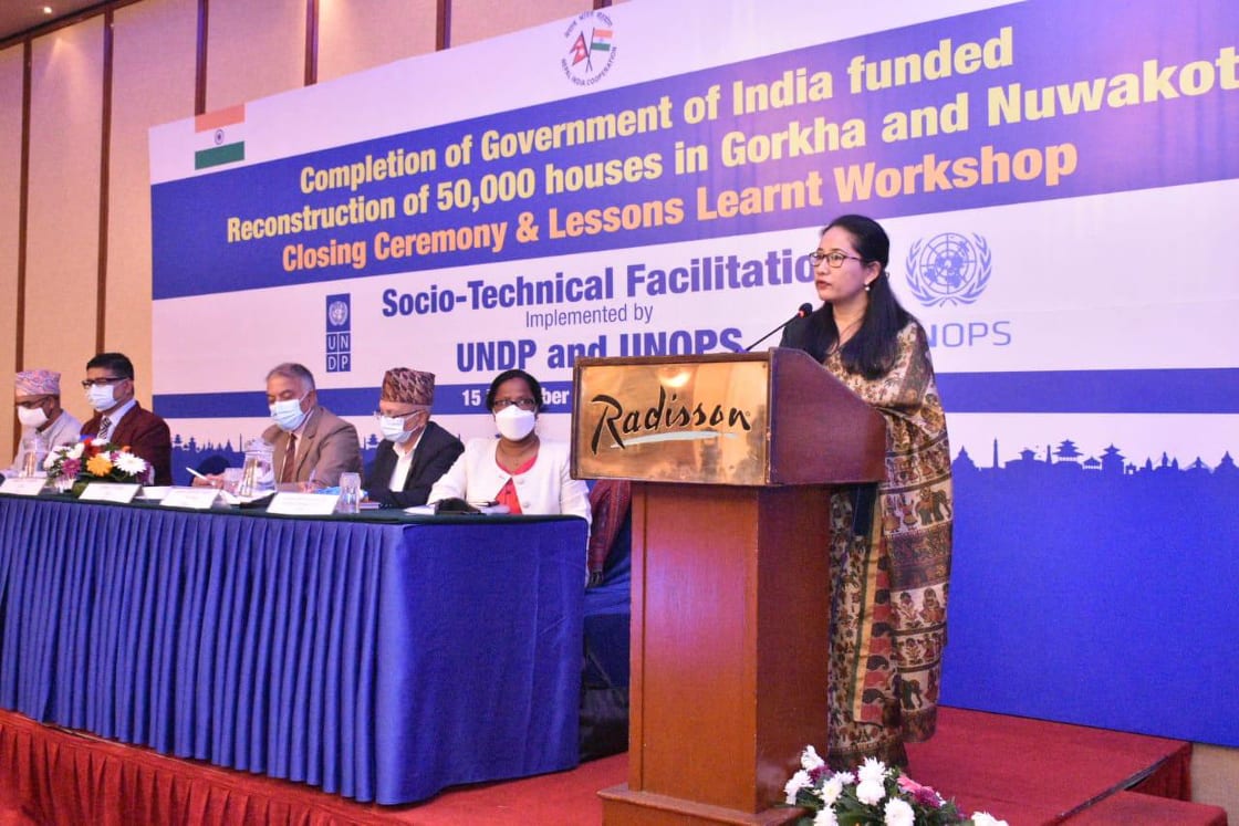 During the event, Ms. Khampa announced that reconstruction of 50,000 private houses as committed by Government of India have been completed with Owner Driven Reconstruction Approach adopted by Government of Nepal. UNDP and UNOPS were engaged by Government of India in March 2018 to provide socio-technical facilitation and consultation (STFC) services to earthquake affected beneficiaries in 4 Urban Municipalities and 14 rural municipalities of Gorkha and Nuwakot districts. GoI committed USD 150 million as post-earthquake assistance package on housing sector to provide financial and technical support for reconstruction of 50,000 beneficiaries, including USD 100 million grant and USD 50 million under our Fourth Line of Credit.