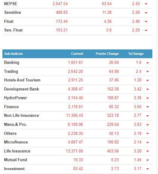 KATHMAMDU: The (Nepal Stock Exchange) Nepse index has sharply declines and closed at 2,547.04 today after losing 63.54 points fall.