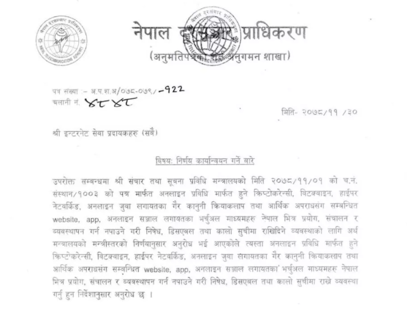 KATHMANDU: Nepal Telecommunications Authority (NTA) has instructed Internet Service Providers (ISPs) to shut down illegal websites and apps, including cryptocurrency, hyper-networking and online gambling.