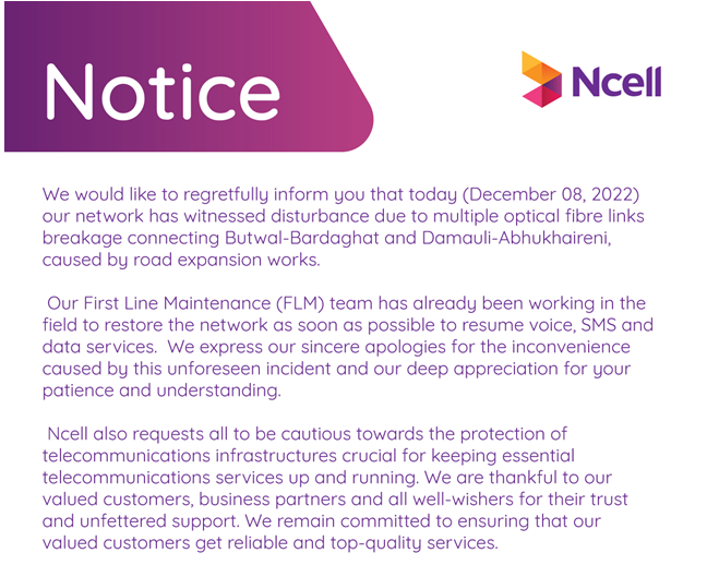 According to the company, the disruption was caused due to multiple optical fibre link breakages connecting Butwal-Bardaghat and Damauli-Abhukhaireni.