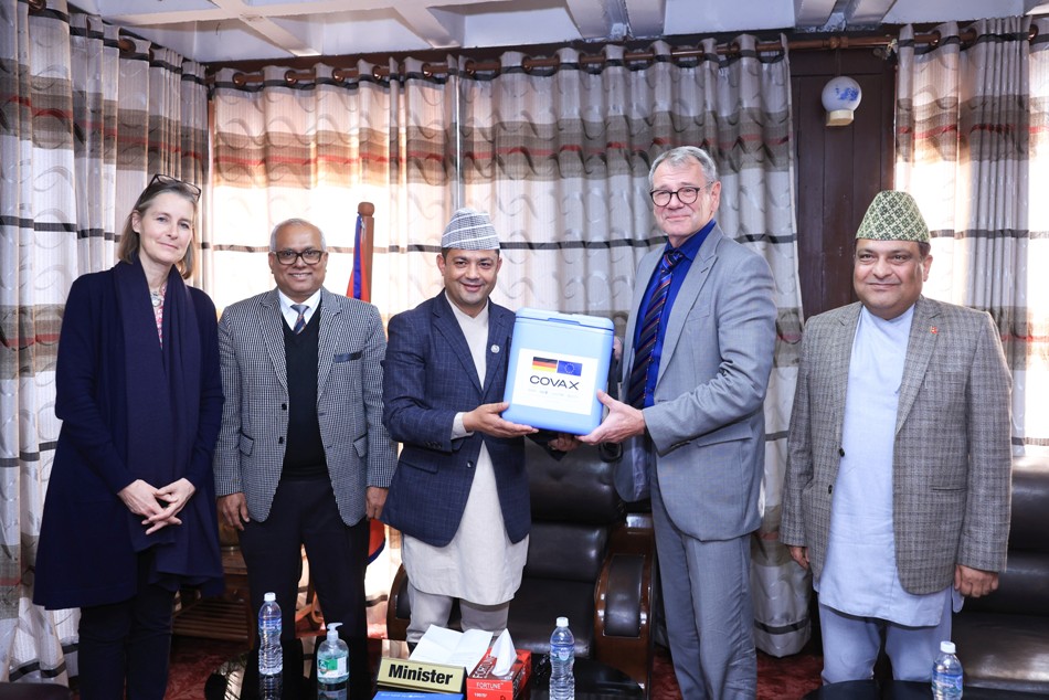 German Ambassador to Nepal, Dr Thomas Prinz, handed over the vaccines to Minister for Health and Population Padam Giri at the ministry on Wednesday in the presence of UNICEF Representative to Nepal Elke Wisch and WHO Representative to Nepal Dr Rajesh Sambhajirao Pandav.