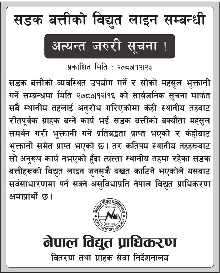 KATHMANDU: The Nepal Electricity Authority (NEA) has issued a stern warning to local governments regarding the impending disconnection of power lines to street lights. In a notice issued today, the NEA cautioned local governments to promptly settle outstanding electricity tariffs accumulated from the usage of street lights. Failure to address these dues may lead to the disconnection of electricity supply to street lights without prior notification.