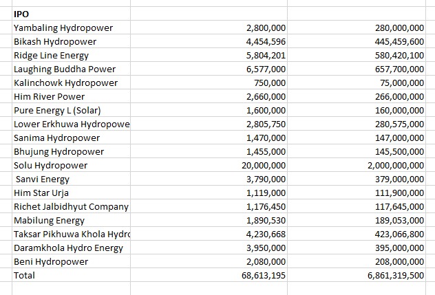 Despite 42 companies issuing IPOs in the last fiscal year, including 29 hydropower companies, no IPOs have been issued for hydropower companies apart from Lumbini Urja Company’s IPO on Bhadra 5 of the current fiscal year.