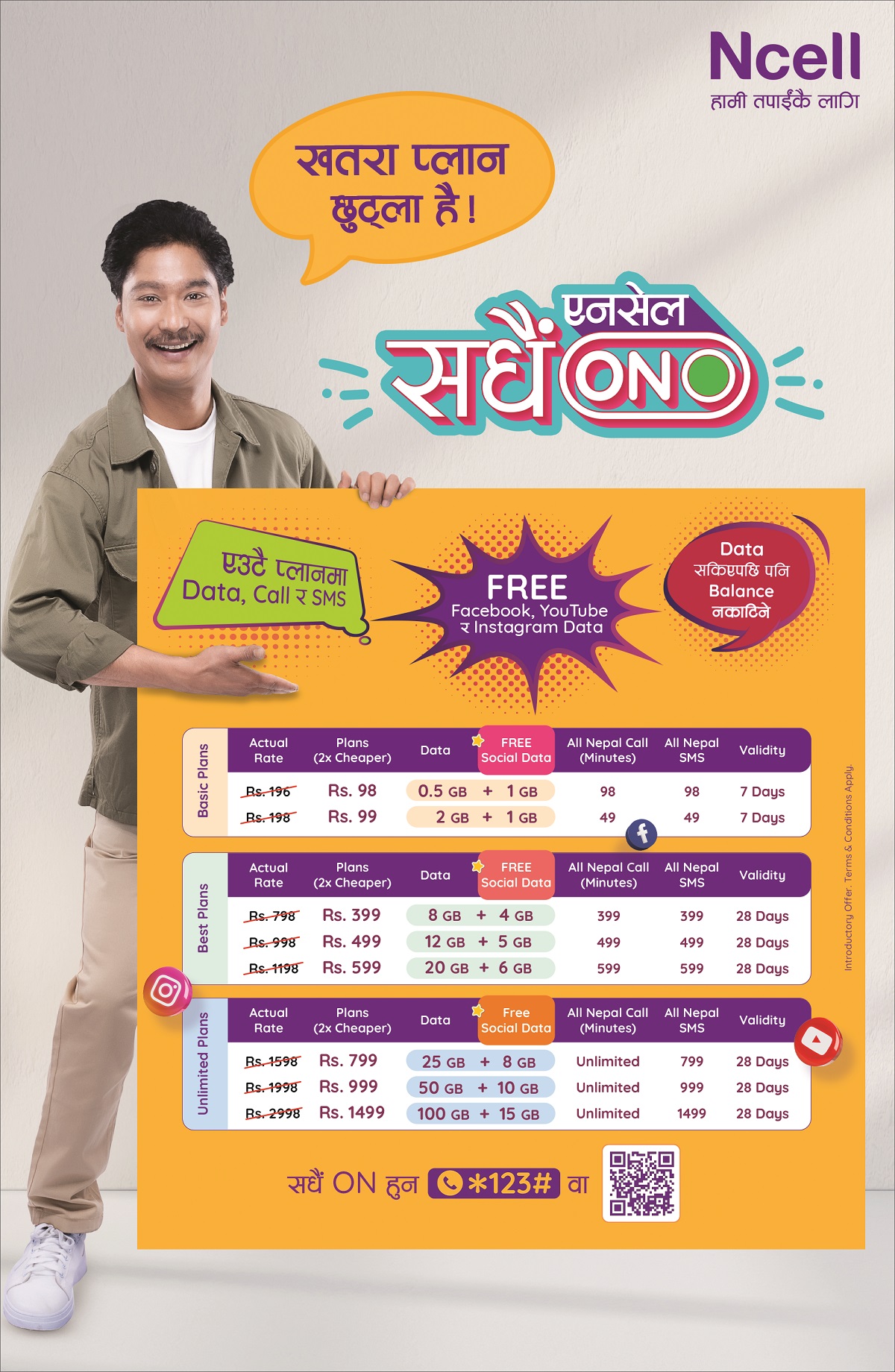 With SadhainON, Ncell is offering eight new plans under three categories—Basic, Best and Unlimited—starting at Rs. 98 per week to Rs. 1,499 for 28 days i.e. a month. Each plan bundled with data, all Nepal call talk timeand all Nepal SMS, comes at a 2 times cheaper rate. That is not all; customers also get free social media data.