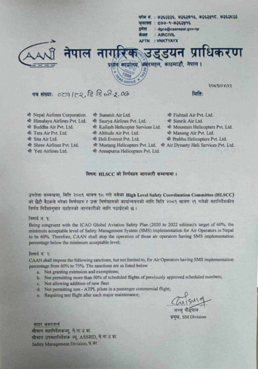 Director General Pradeep Adhikari emphasized that the authority’s decision aligns with the International Civil Aviation Organization’s (ICAO) safety strategy. With the consensus of the ‘High Level Safety Coordination Committee,’ which includes representatives from all airlines, CAAN aims to uphold a minimum compliance rate of 60 percent for SMS implementation in Nepal.