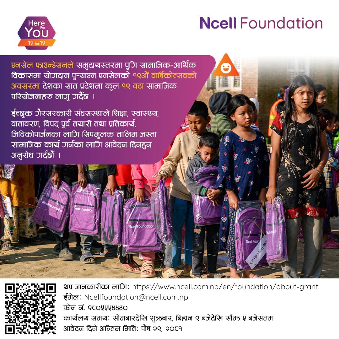Eligible and interested organizations can apply for the grant by visiting the Ncell Foundation website https://www.ncell.com.np/en/foundation and clicking on ‘Apply for Grant’. For further details on eligibility criteria and application procedures, visit https://www.ncell.com.np/en/foundation/about-grant or email [email protected].