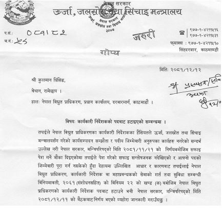 Ghising, appointed for his second term on August 9, 2021 (Shrawan 25, 2078), was due to complete his tenure on August 9, 2025 (Shrawan 25, 2082). However, the Cabinet, in a meeting on the evening of March 25 (Chaitra 11), removed him four months early and appointed Hitendra Dev Shakya as the new Executive Director. The Energy Ministry formally informed Ghising of his dismissal through a letter, listing 10 reasons for his removal.