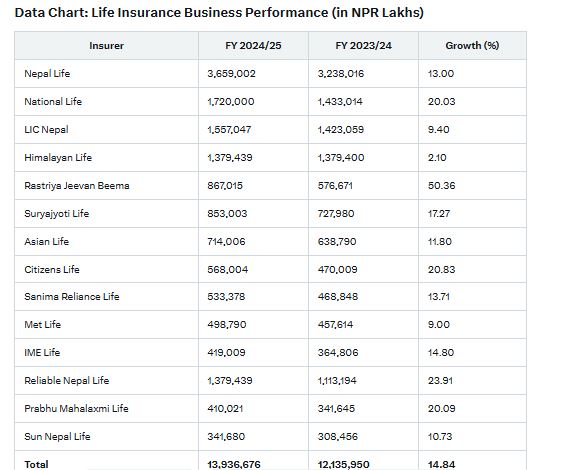 Other notable performers include IME Life with NPR 4.19 billion (14.80% growth), Reliable Nepal Life at NPR 13.79 billion (23.91% growth), Prabhu Mahalaxmi Life with NPR 4.10 billion (20.09% growth), and Sun Nepal Life at NPR 3.41 billion (10.73% growth).