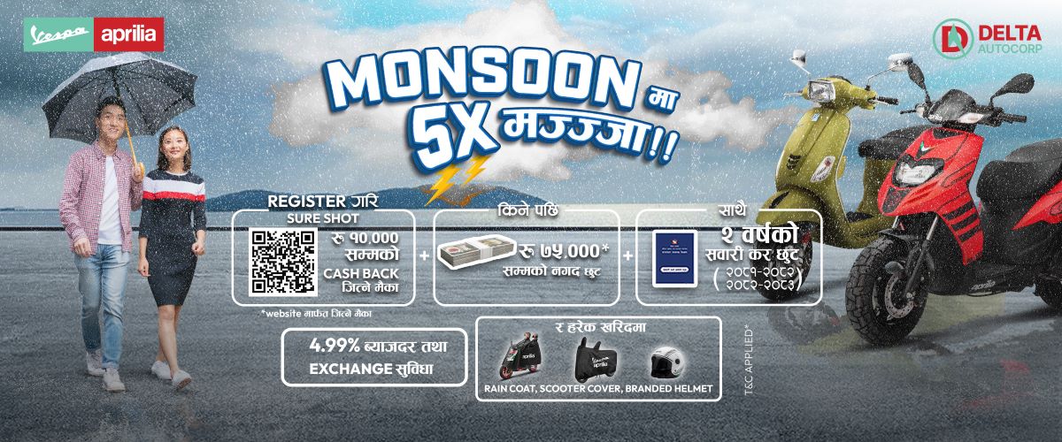 KATHMANDU: Delta AutoCorp Pvt. Ltd., the authorized distributor of Vespa and Aprilia scooters in Nepal, has unveiled its “Monsoon Ma 5X Mazza!!” campaign, a limited-time offer designed to enhance the scooter-buying experience during the rainy season. Targeting enthusiasts nationwide, the promotion provides significant discounts and benefits for Vespa and Aprilia purchases.