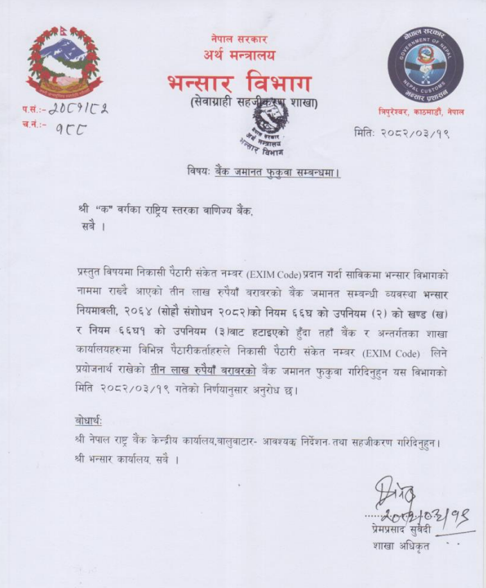 KATHMANDU: The Department of Customs has unveiled a major overhaul in trade procedures with the introduction of the 16th amendment to the Customs Regulation 2064, effectively eliminating the mandatory requirement of a bank guarantee for obtaining an Export-Import (EXIM) Code.