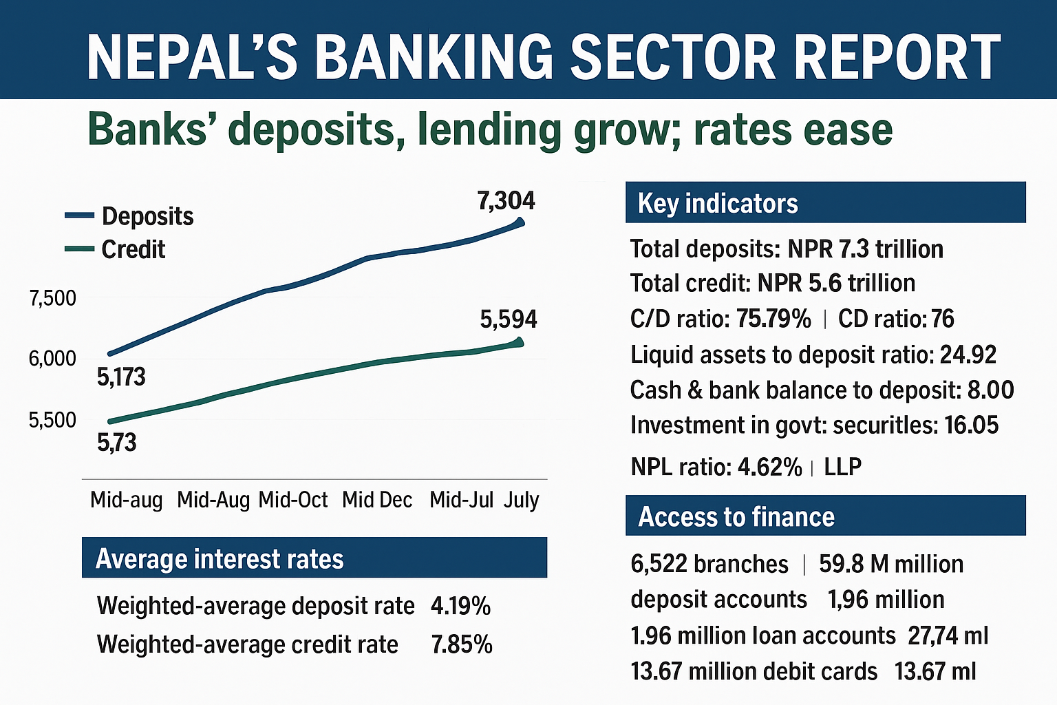 Nepal’s banks end Asar on a stronger footing: deposits top NPR 7.3T, lending nears NPR 5.6T, rates ease
