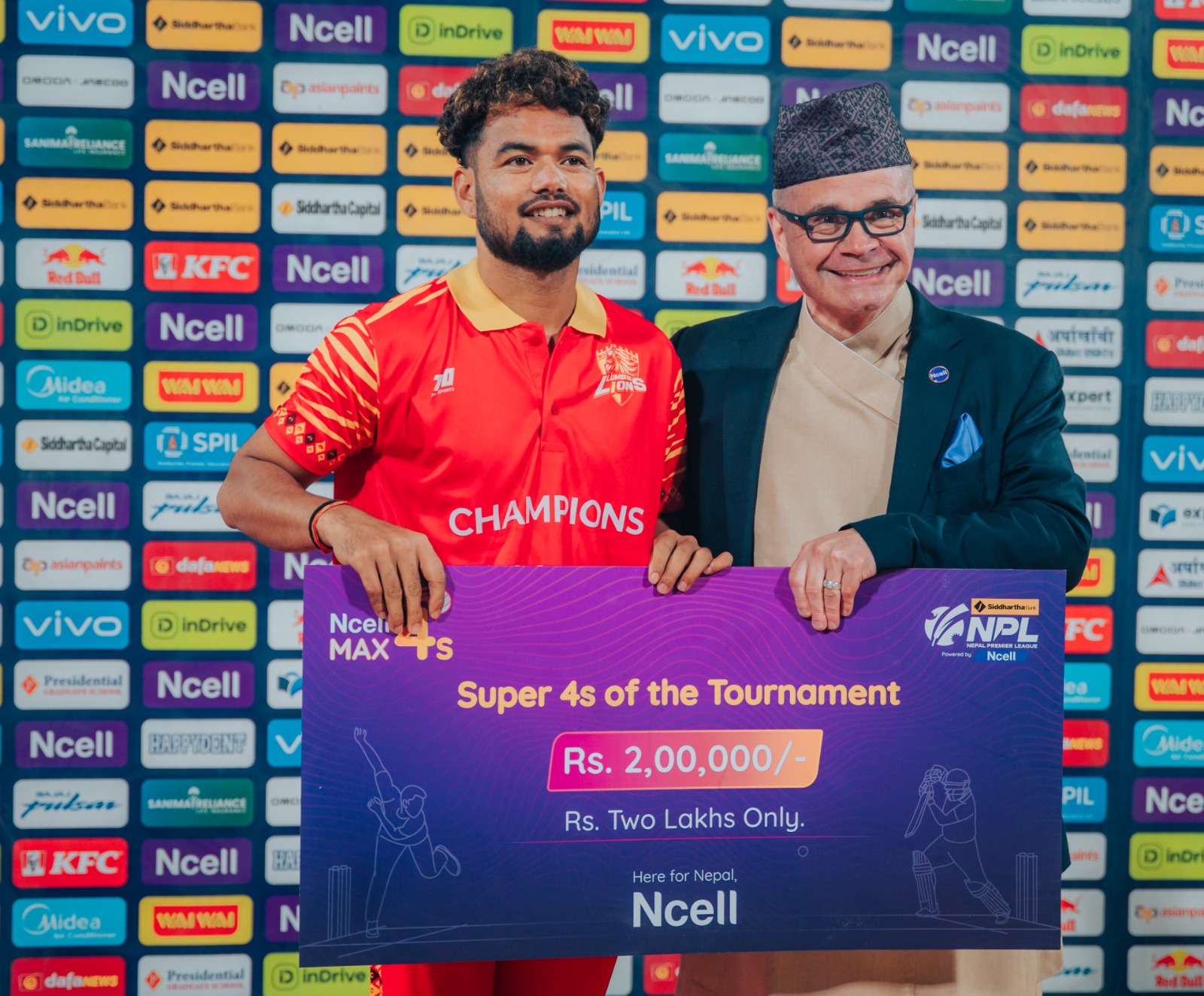 This year as well, Ncell was ‘Powered By’ partner of NPL. The company had also provided a cash prize of Rs. 25,000 to players hitting maximum numbers of 4s in each match played during season 2. In addition, Adam Rossington of Pokhara Avengers was awarded a cash prize of Rs. 200,000 for contributing the highest number of fours across the season.