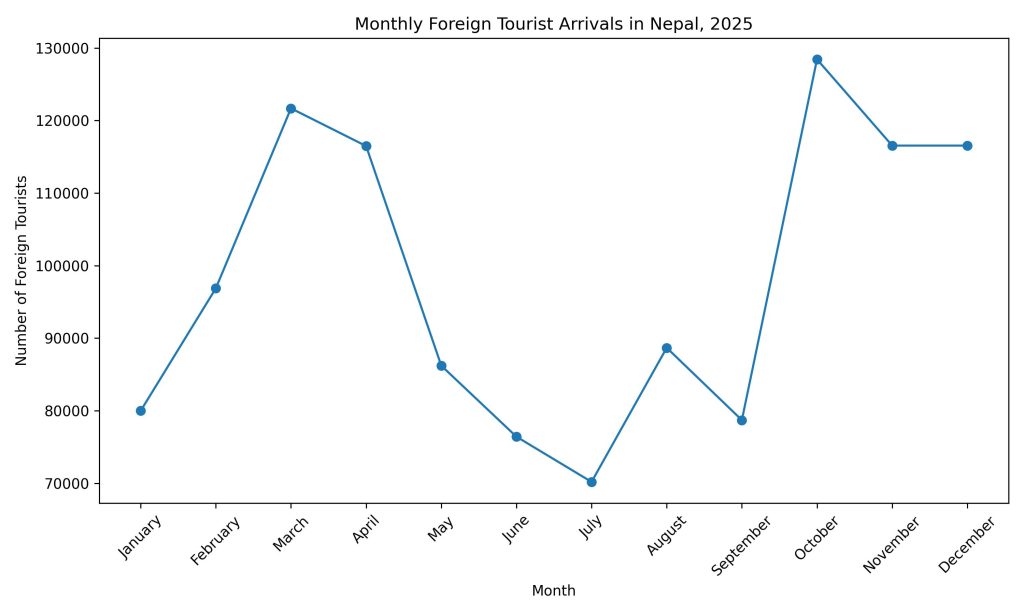 Tourist arrivals peaked in October, with more than 128,000 foreign visitors, coinciding with Nepal’s prime autumn tourism season.